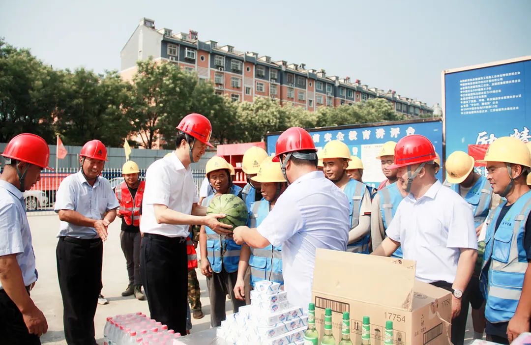 上午,陳永明一行來到邯鄲美的錦觀城項目,對日夜奮戰在一線的廣大施工人員表示誠摯的問候,并向他們發放了毛巾、飲料、花露水、西瓜等慰問品,囑咐大家在搶工期、趕進度的同時,一定要做好安全生產、防暑降溫和疫情防控,確保自身安全和身體健康。